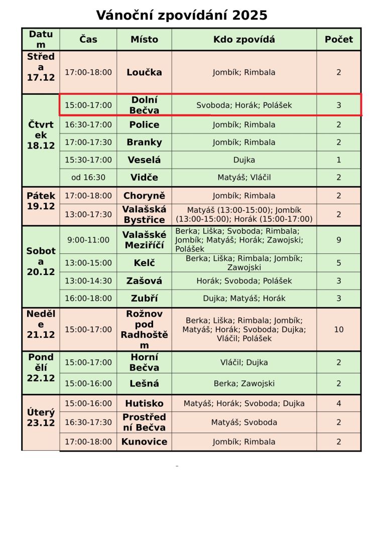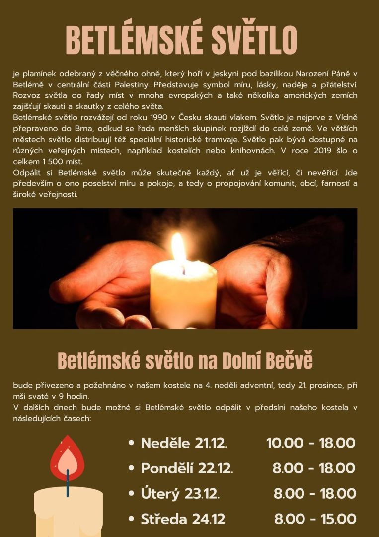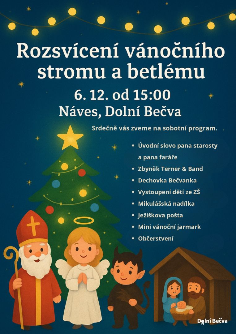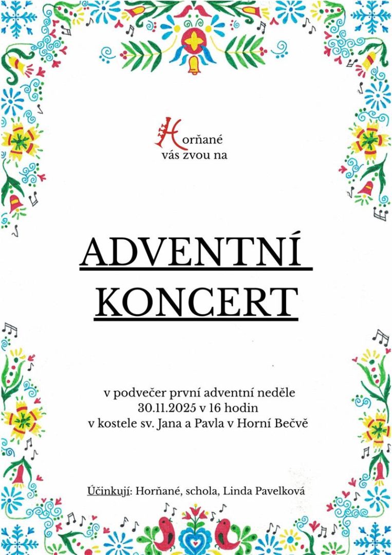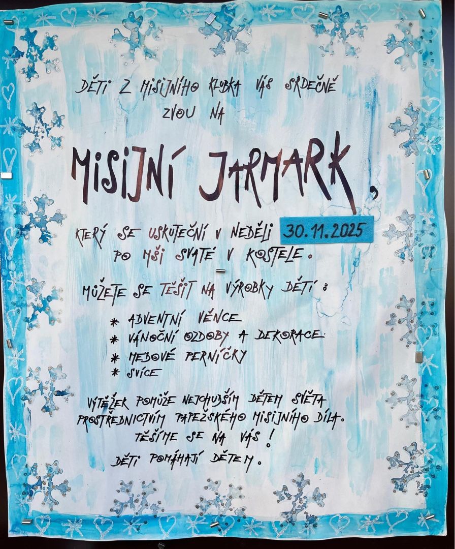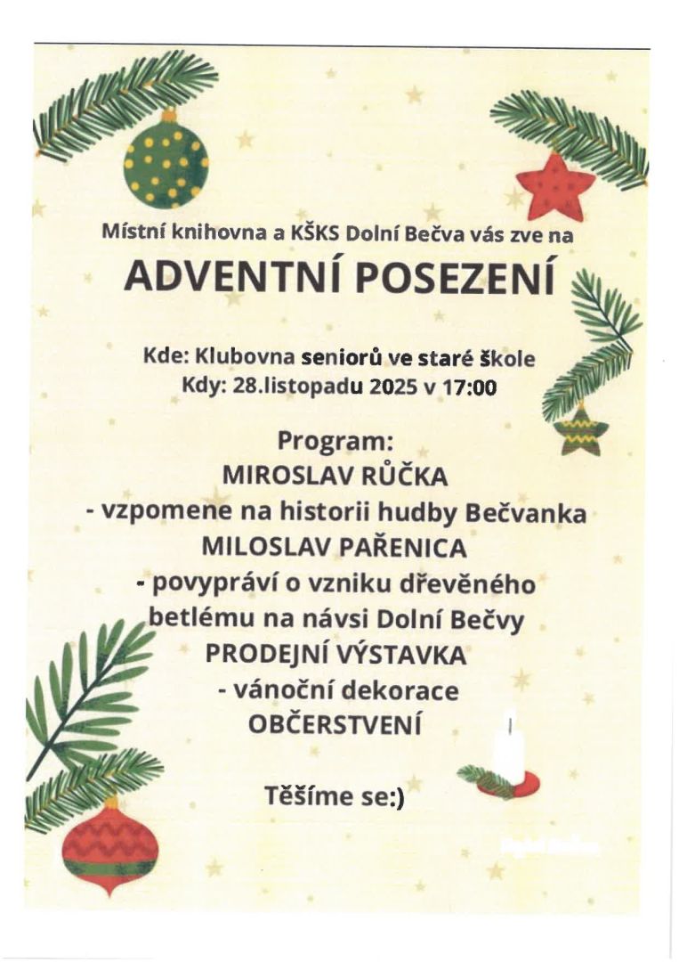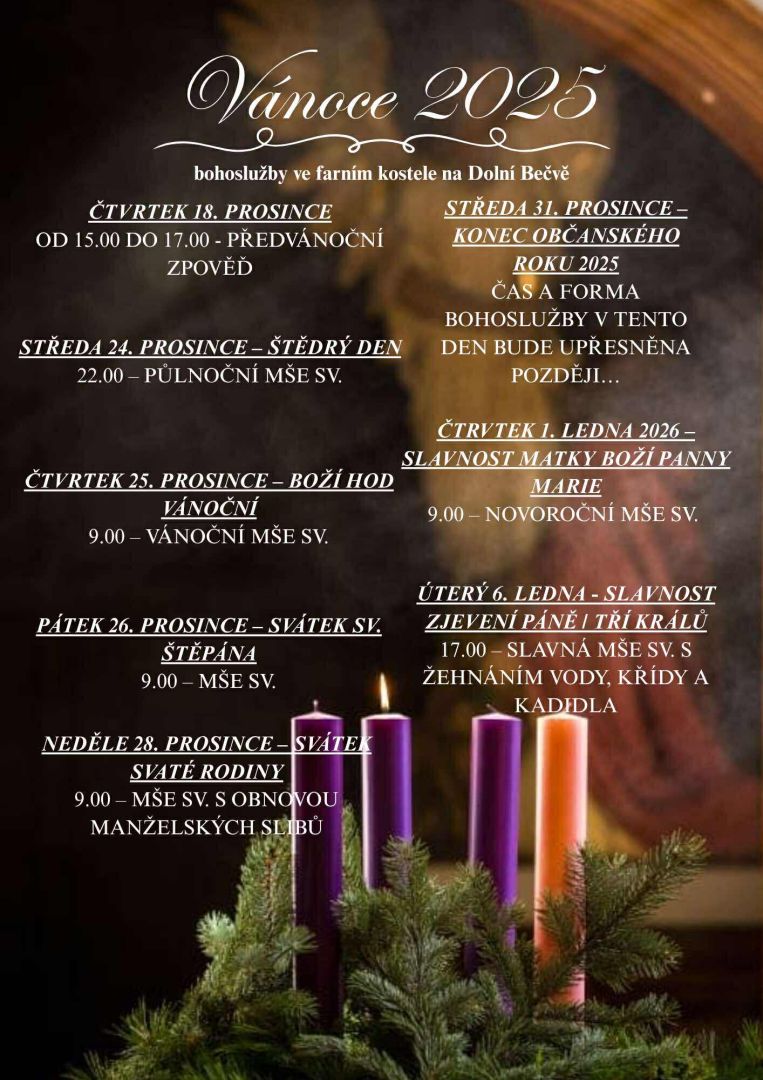 9:00 - mše sv. za + Miroslava Porubu a za živou i zemřelou rodinu Porubovu, Blinkovu a Vašutovu žehnání adventních věnců na začátku mše sv. po mši svaté se budou zapisovat na faře úmysly na rok 2026. po mši svaté proběhne Adventní misijní jarmark našeho misijního klubka. (Bude možnost zakoupit adventní věnce, vánoční ozdoby a dekorace, svíčky a perníčky.) 16:00 - Adventní koncert v kostele na Horní Bečvě, účinkující: Horňané, schola, Linda Pavelková |