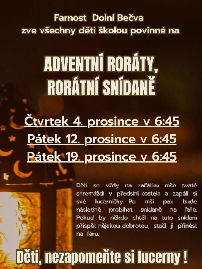 blíží se advent a s ním spojené roráty a rorátní snídaně. První budou ve čtvrtek 4. prosince. U zpovědnice jsou termíny, kde se můžou zapsat ti, kteří by chtěli pomoct s přípravou, obsluhou a úklidem po rorátních snídaních.